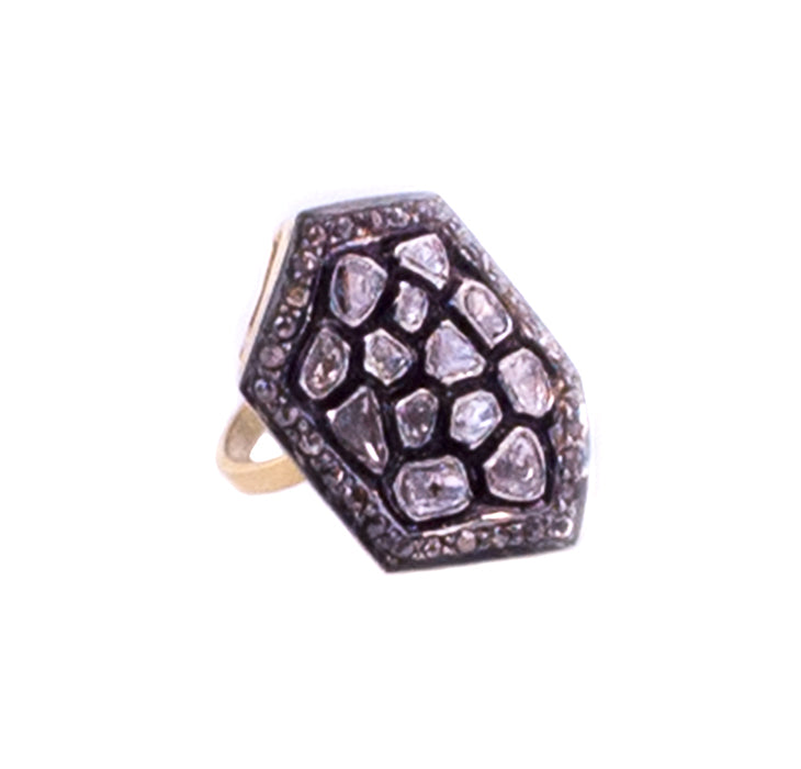 Rough cut & champagne diamond hexagon ring with black rhodium finish & 18k yellow gold overlay on band.