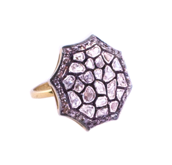Rough cut & champagne diamond spider web ring with black rhodium finish & 18k yellow gold overlay on band.