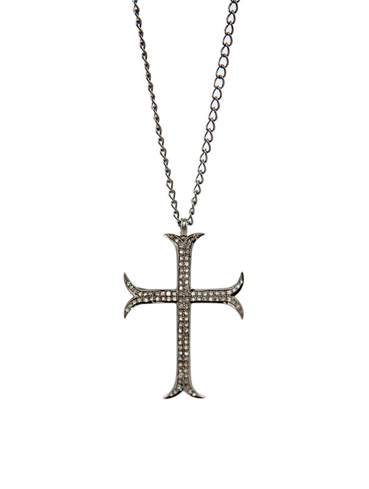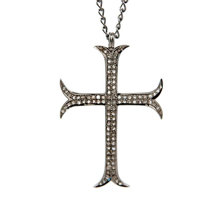 Cross necklace with champagne diamonds, silver, black rhodium finish & 40’’ silver chain.